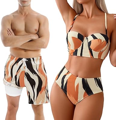 Couples Matching Swimsuit Zebra Print, Push-Up Bra Women Bikini Set, Soft Elastic Men Swim Trunks